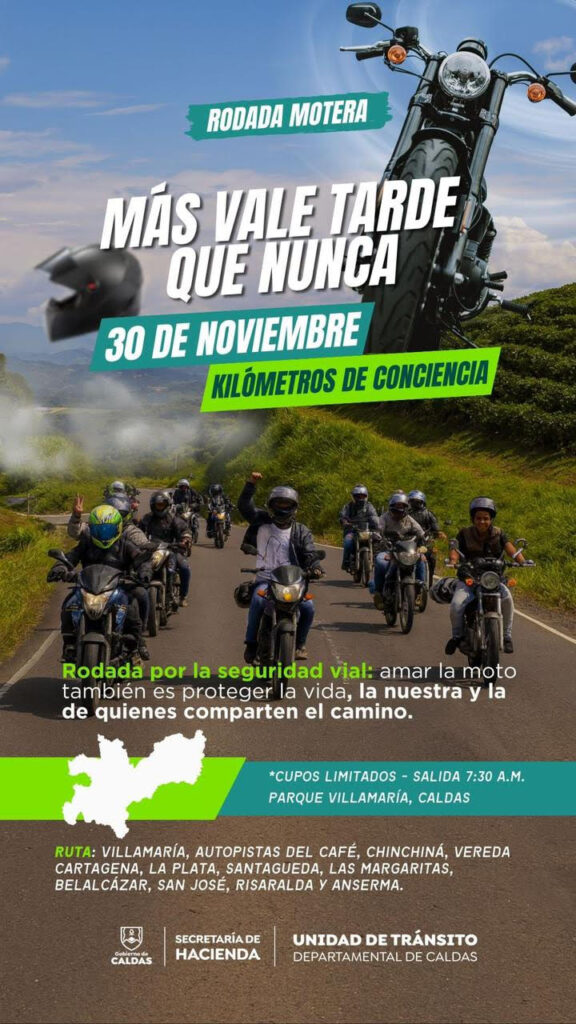 La rodada motero reunirá a 150 motociclistas. El recorrido iniciará en Villamaría y pasará por la Autopista del Café, visitando Chinchiná, Palestina, Belalcázar, San José y Risaralda, hasta finalizar en Anserma.