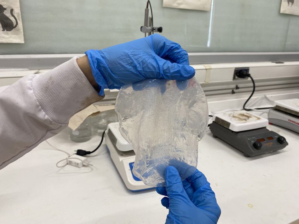 En el Laboratorio de Materiales de la UNAL Manizales, la membrana se cultiva y transforma en láminas delgadas y flexibles, conocidas en ciencia como hidrogeles, materiales caracterizados por su alta capacidad para retener agua.