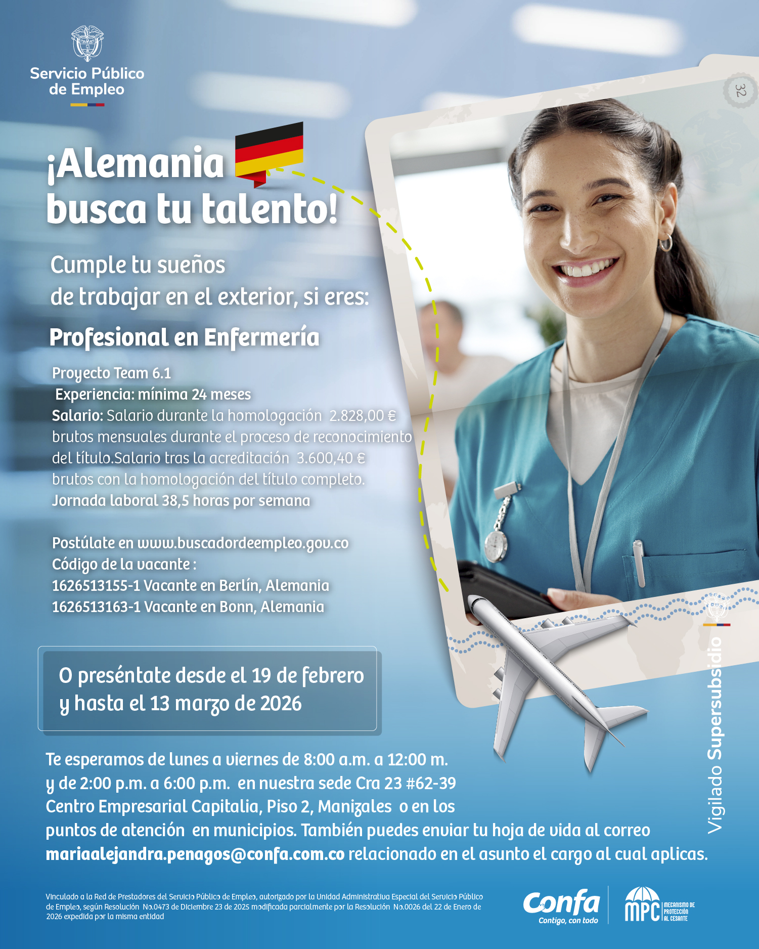 La Agencia de Gestión y Colocación de Empleo de Confa, autorizada como Agencia de Empleo Transnacional y como parte del Proyecto TEAM 6.1 (Trabajadores colombianos Especializados para Alemania) abrió hasta el 13 de marzo de 2026, nueva convocatoria dirigida a profesionales de enfermería para trabajar en Alemania, de este modo contribuye al mejoramiento de la calidad de vida de los trabajadores en Caldas y facilita la ampliación de opciones laborales en el exterior en el marco de una migración digna y segura.